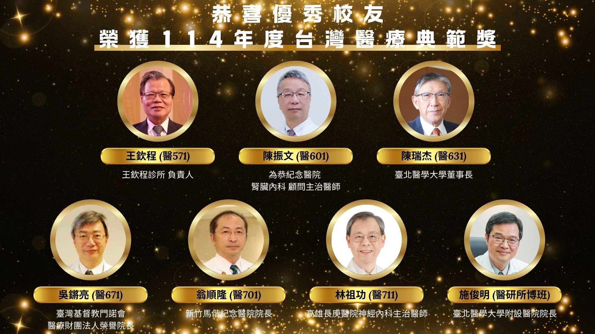 恭喜優秀校友榮獲114年度「台灣醫療典範獎」, 於二十位獲獎者中,北醫校友共有七位!
