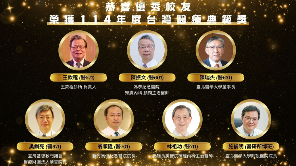 恭喜優秀校友榮獲114年度「台灣醫療典範獎」, 於二十位獲獎者中,北醫校友共有七位!